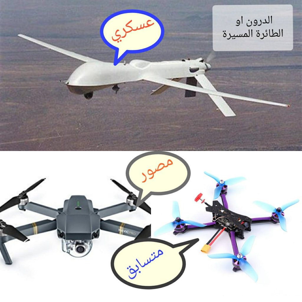 اما نحن كمستخدمي تقنية الدرون فنتضرر من انتشار اخبار الدرونات العسكرية بسبب هذه الاختلاط في تصور الدرونات عند اغلب الناس. لذلك قمت بعمل صورة توضيحية لمساعدة الناس على التفريق بين الدرون العسكري ودرون السباق والتصوير الذي نستخدمه: