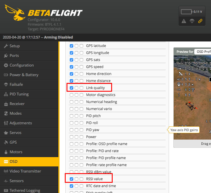 يمكنك تفعيل مراقبة قوة وجودة الاشارة في نظام ال بيتا فلايت عن طريق قسم ال OSD.