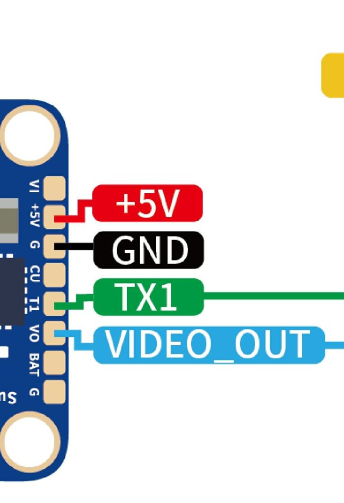 أما اشارة الفيديو الخارجة من منظم الطيران Video Out أو VO فكالعادة يتم شبكها مع مرسل الفيديو VTX على منفذ الفيديو الوحيد فيه ليتم ارسال الاشارة لاحقاً الى نظارة الطيار.