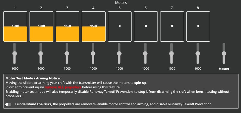 قم باختبار المحركات. ستلاحظ في صفحة المحركات ان مؤشر المحرك ليس على نقطة الصفر وانما في منتصف المدى. وذلك سببه ان ال Throttle الان يعمل بالاتجاهين الاعلى والاسفل:
