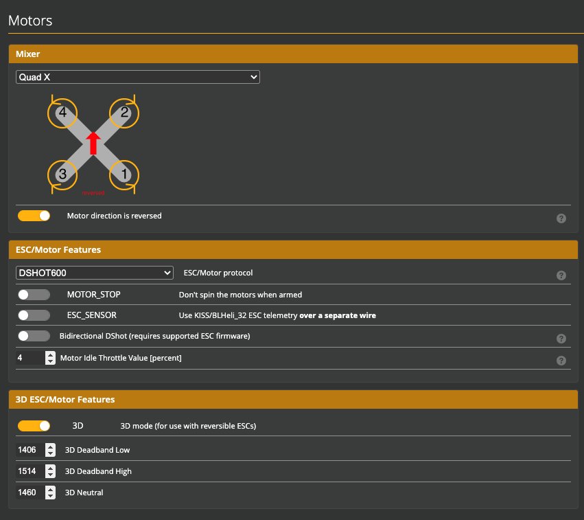 بعد ذلك قم بتوصيل منظم الطيران FC الى برنامج بيتافلايت. قم بتفعيل 3D mode في صفحة Configuration او صفحة المحركات في النسخ الحديثة من بيتافلايت.